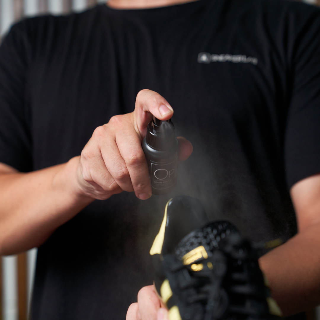 Next, we will add our Protective Sprays. Firstly, use our Odor Protector within the soles of the sneaker to remove unwanted odors and prevent bacteria from building up. If the inner soles are removable, take them out and spray the inside of the sneaker and the inner soles.