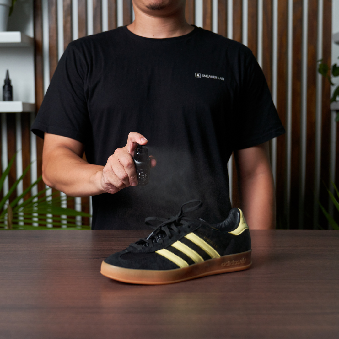 Lastly, spray our Sneaker Protector all around the exterior of the sneaker to prevent dirt and bacteria from setting in and in turn making your next clean easier. You are now ready to hit the streets in your clean Adidas Gazelles!