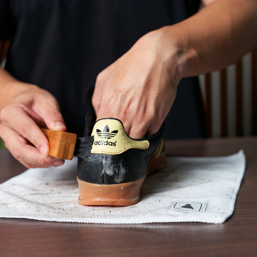 Next, evenly apply our Sneaker Cleaner solution over the entire surface of the sneakers. Submerge our Premium Brush into a container of water and begin scrubbing the nylon upper in a circular motion until a foamy lather forms. Proceed to clean the outsole of the sneaker, ensuring to scrub until all dirt is lifted from the surface.