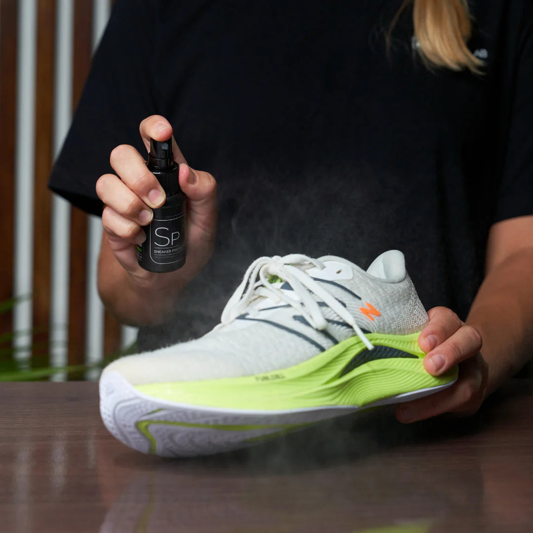 Step 7: Following that, liberally spray our Sneaker Protector across the entirety of the shoes exterior to create a protective barrier against dirt and bacteria accumulation. This proactive step will streamline your next cleaning process while keeping your shoes looking fresh for longer periods. You are now good to go, get ready to hit your run with full force!