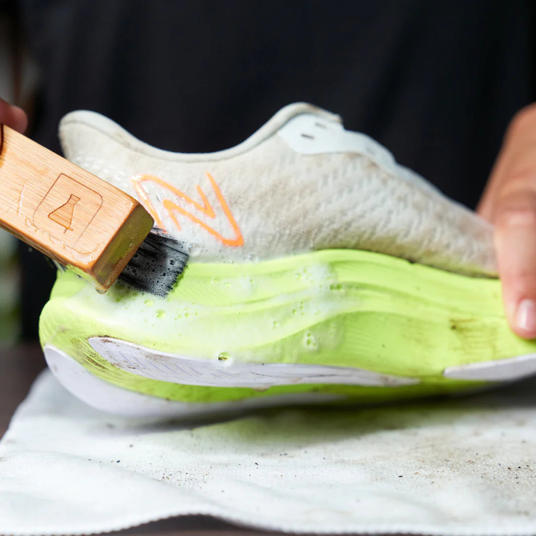 Step 1: Begin by prepping your FuelCells for a thorough cleaning session. Start by unlacing your shoes and carefully setting the laces aside for later cleaning. Utilize our Premium Brush to gently remove any excess dirt, paying particular attention to heavily dirty areas.