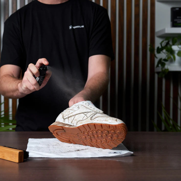 Step 7: Following that, spray our Sneaker Protector across the sneaker's exterior to create a protective barrier against dirt and bacteria. This proactive step will ensure your next cleaning process is made easier, while keeping your sneakers looking fresh for longer periods.