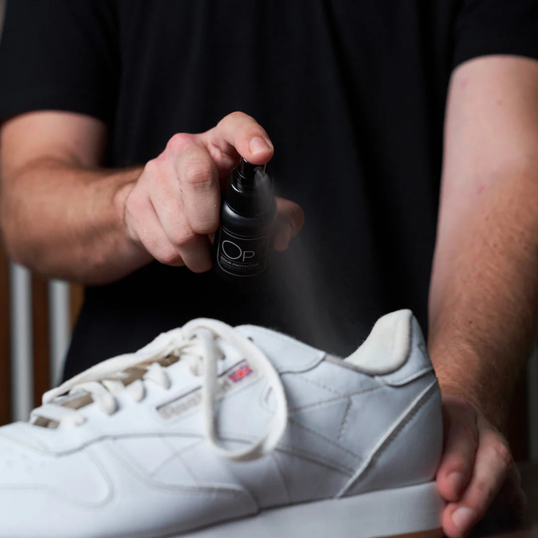 Step 6: Apply our Odor Protector within the soles of your Leather Classics to effectively eliminate unpleasant odors and hinder the growth of bacteria. Take out the insoles and generously spray both the interior of the sneaker and the insoles themselves.