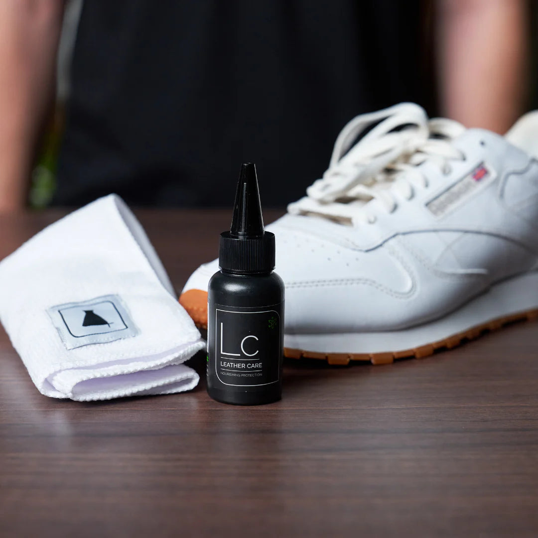 Step 8: Complete the cleaning process by applying our Leather Care solution to the leather outsole using a clean Microfiber towel. This treatment nourishes and safeguards, resulting in a fresh and polished appearance. Additionally, the conditioner shields your Reeboks from harmful UV rays and establishes a water-resistant barrier for added protection.
